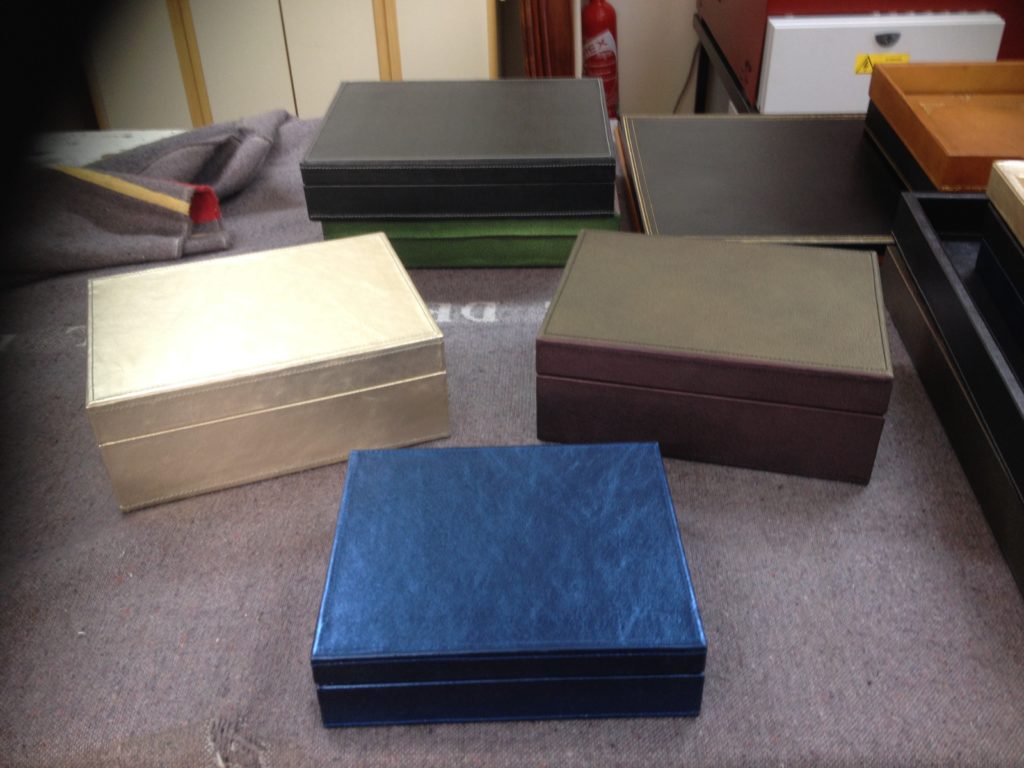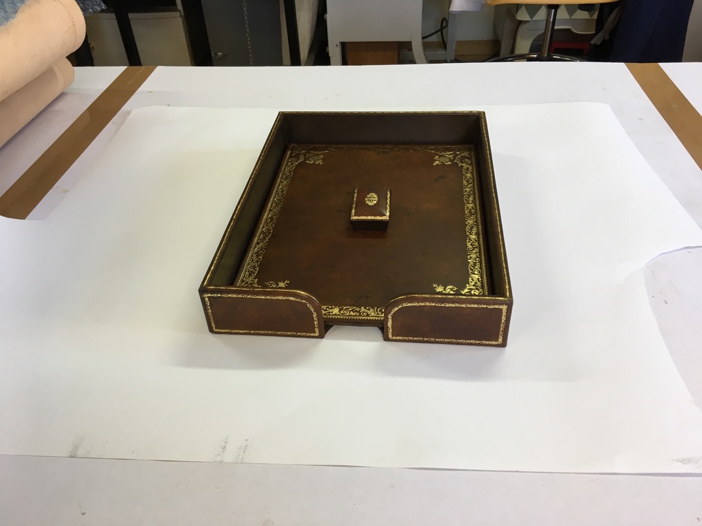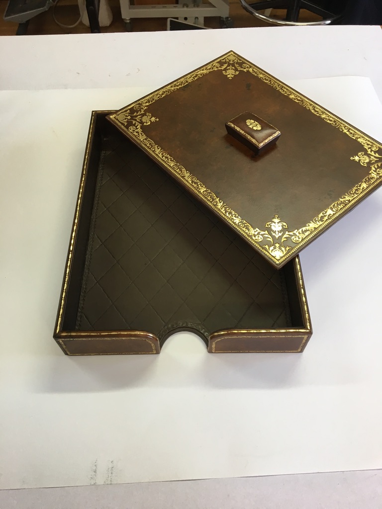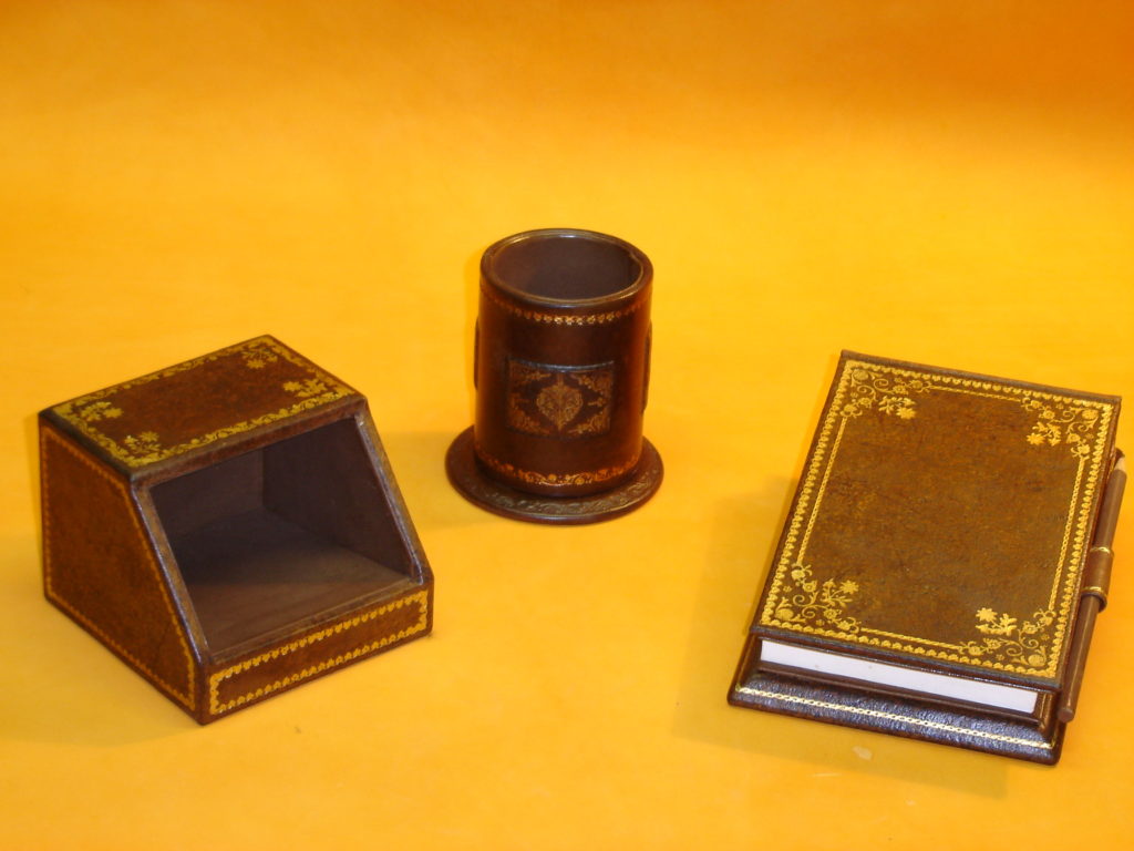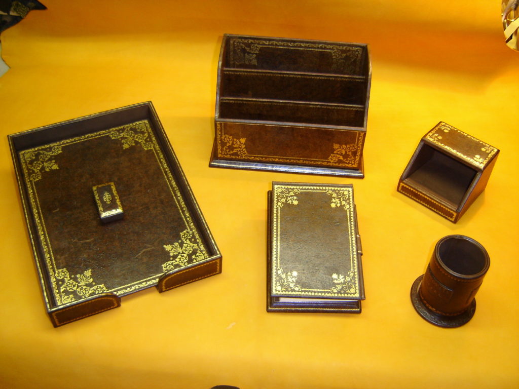 Nous fabriquons des garnitures de bureau de luxe, sous-main, Classeurs, Blocs notes, Corbeilles papiers etc…